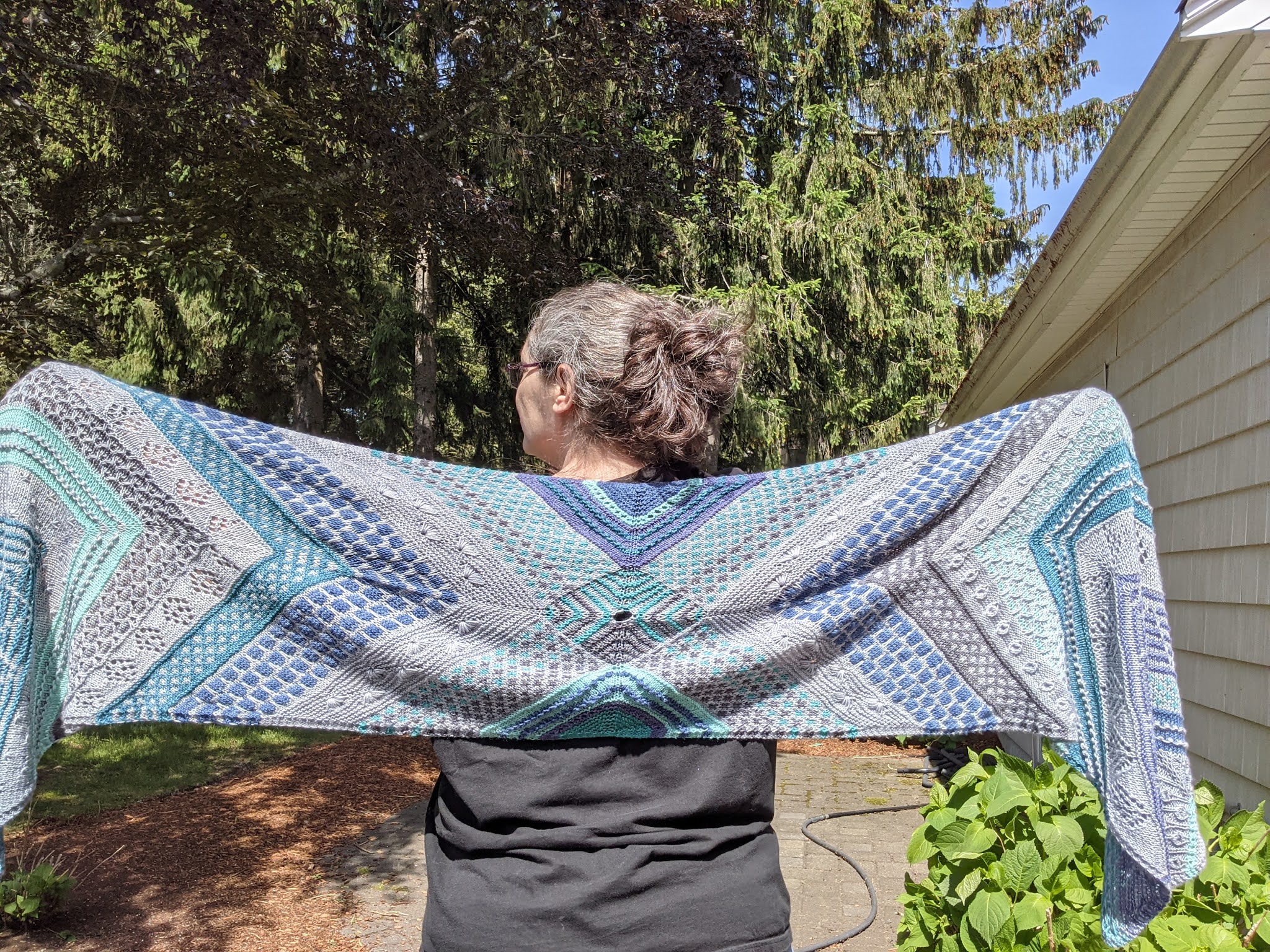 Very much enjoyed the knitalong and my finished shawl is delightfully soft. I love how these colors turned out.